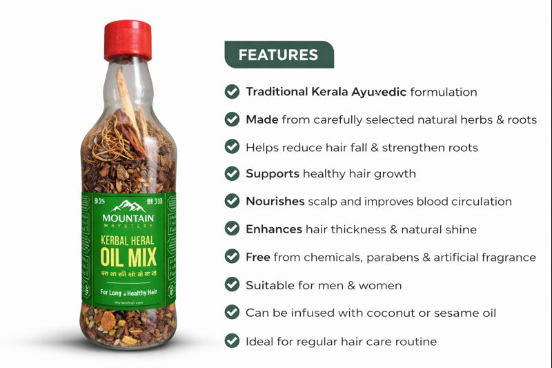 This Herbal Hair Oil Mix is inspired by traditional Kerala Ayurvedic practices. It contains a natural combination of dried herbs, roots, and botanicals known for supporting hair growth, reducing hair fall, and improving scalp health.