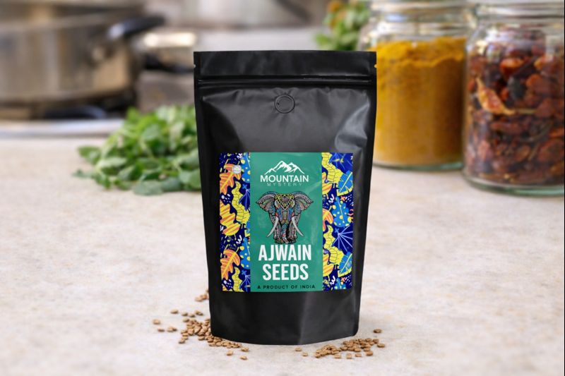 Aromatic ajwain seeds (carom seeds) with strong, warming flavour, perfect for tadka, parathas and snacks, packed fresh by MOUNTAIN MYSTERY in a convenient 100 g pouch.