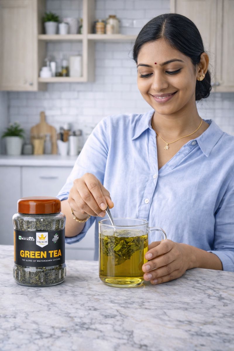केरल की पहाड़ियों से चुनी गई प्रीमियम ग्रीन टी पत्तियां, प्राकृतिक स्वाद और एंटीऑक्सीडेंट्स के साथ, रोज़ाना स्वास्थ्य और वेट मैनेजमेंट के लिए बेहतरीन।